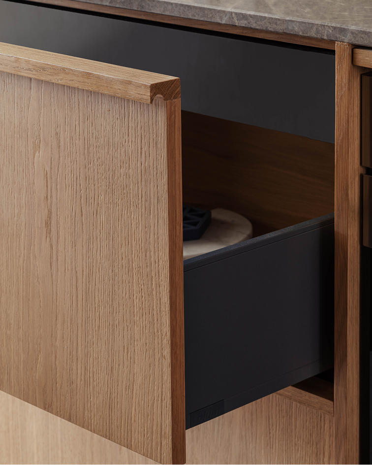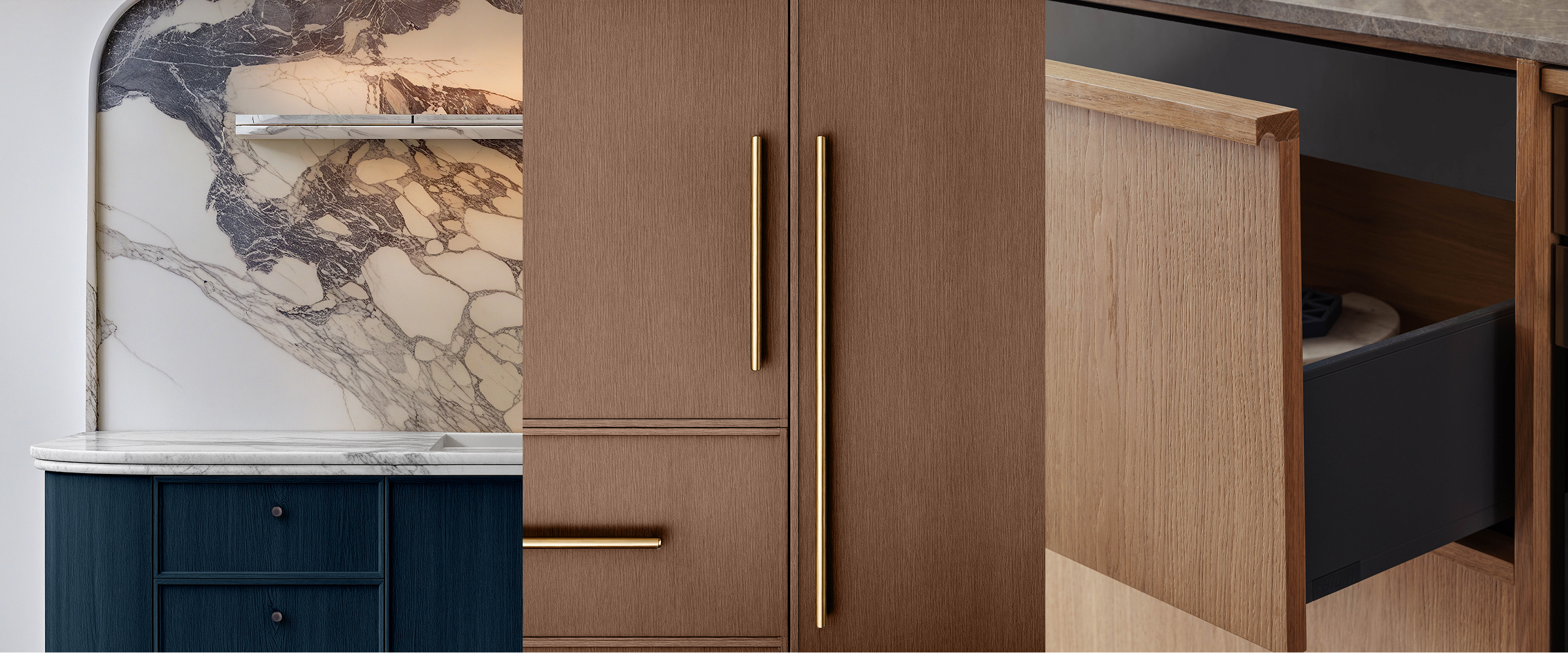 Interior features showcase two-tone carcasses, integrated tray storage, and metal-framed glass drawers, creating kitchens that are warm and minimal, functionality and elegant.