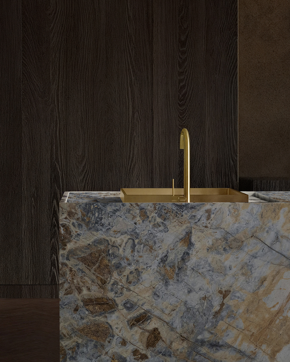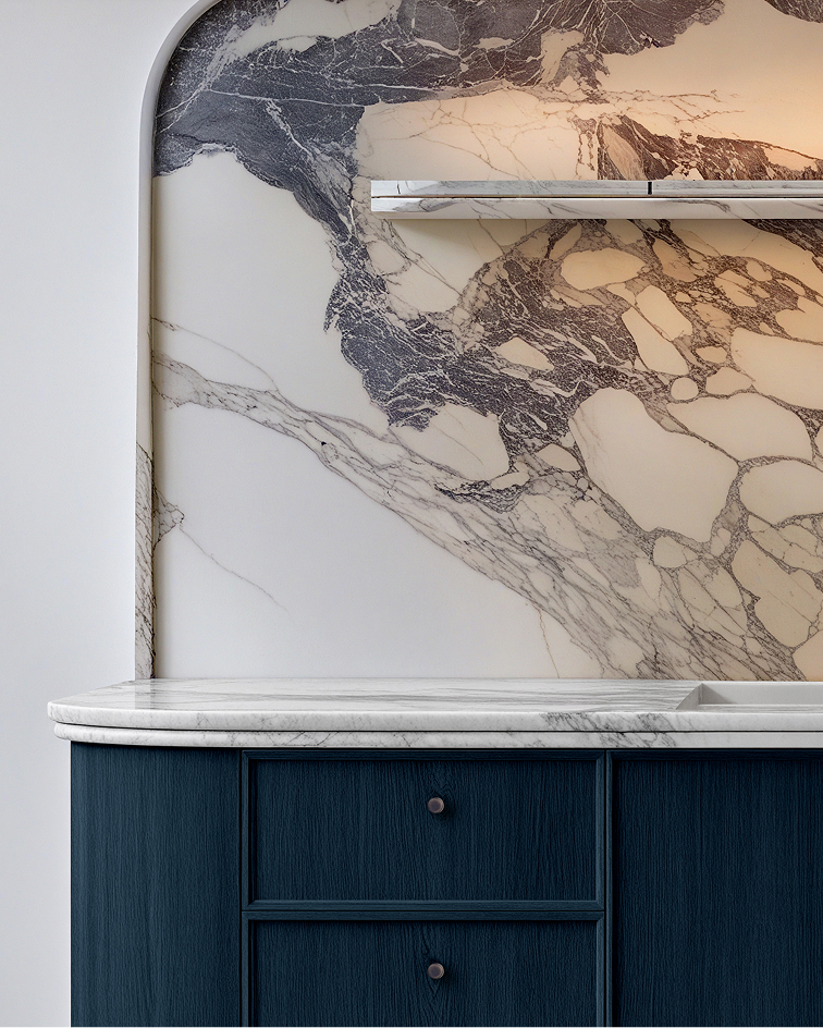 Hand-selected worktop materials include honed limestone, dark soapstone, Belgian blue limestone and natural marble