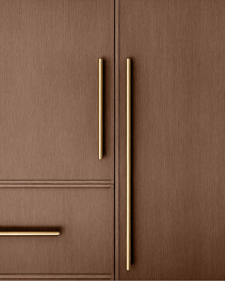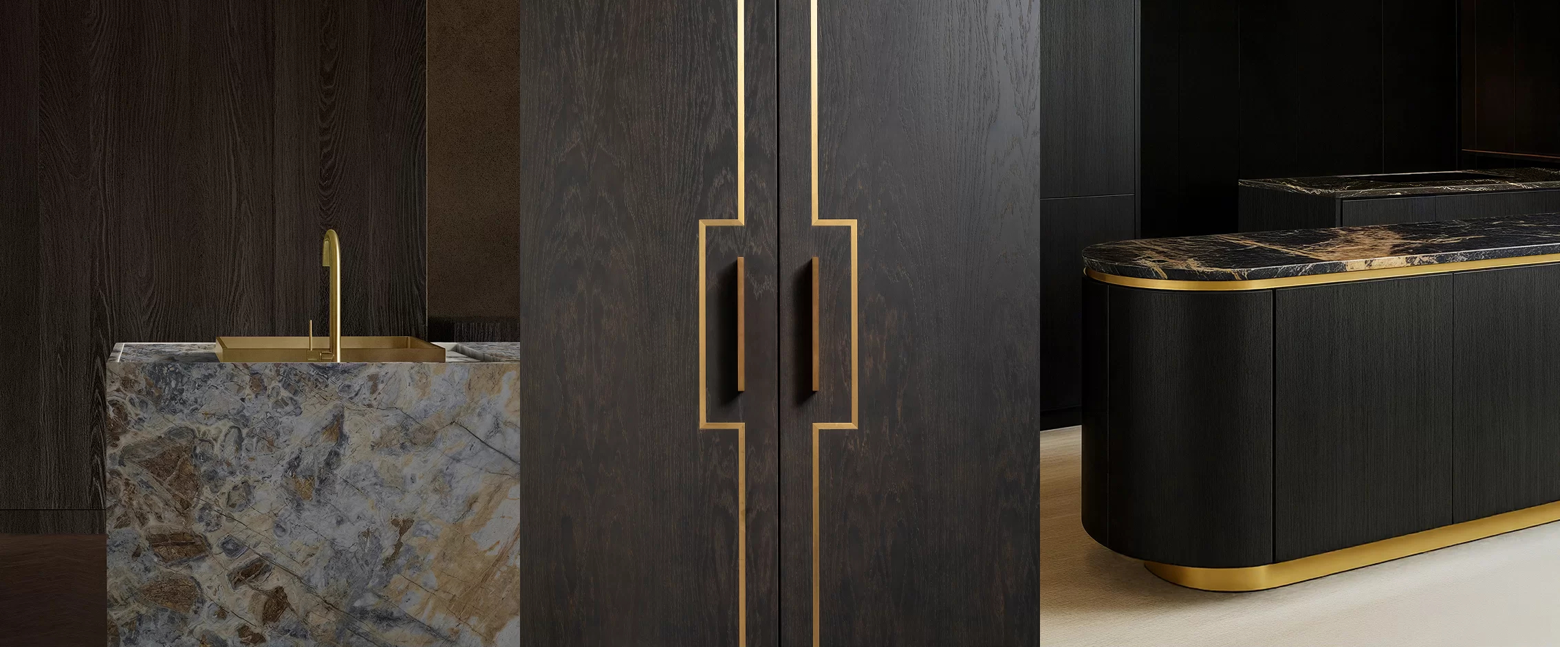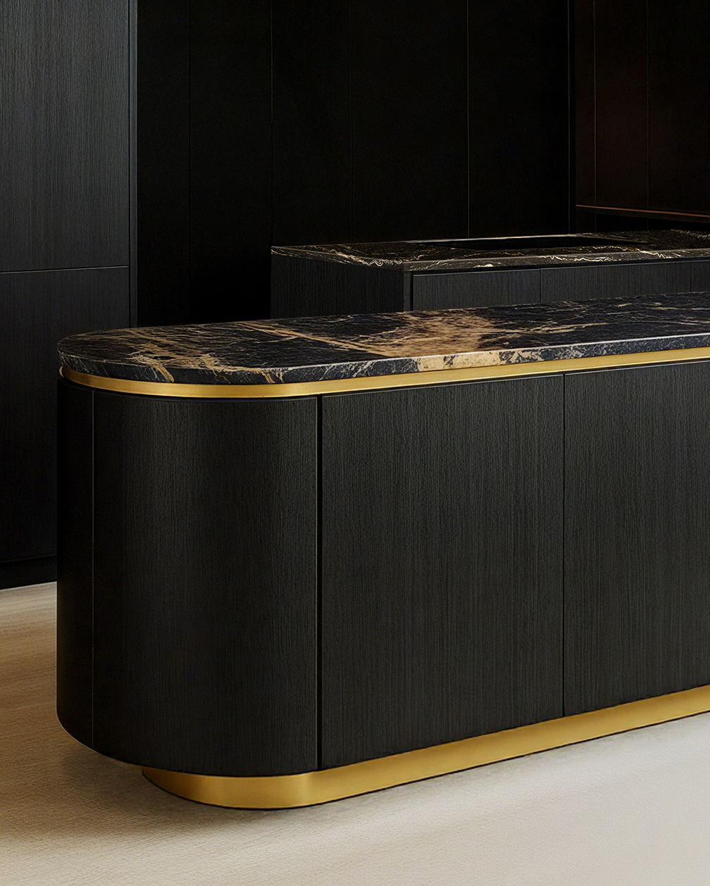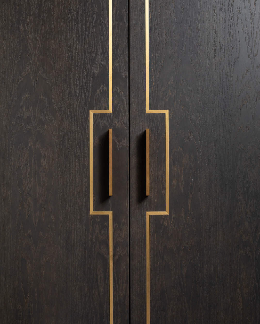 Metal inlays are precision-cut in aged bronze or blackened steel, while metal-framed cabinet doors feature reeded or smoked glass and bespoke leather-clad panels for a luxurious contrast.