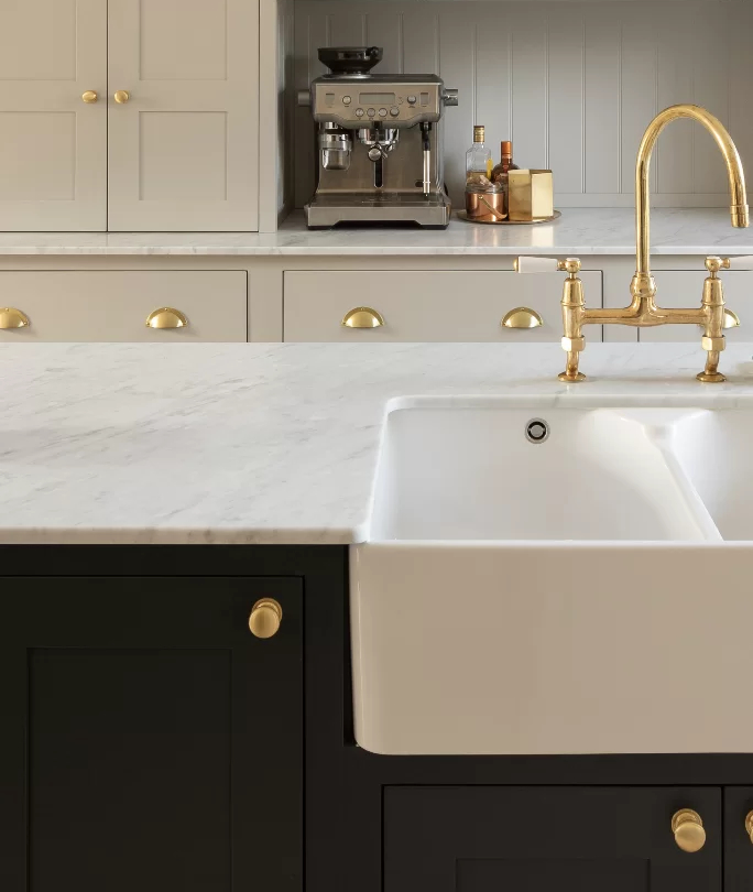 Worktop materials include honed British limestone, Cornish slate, aged soapstone and natural marble.